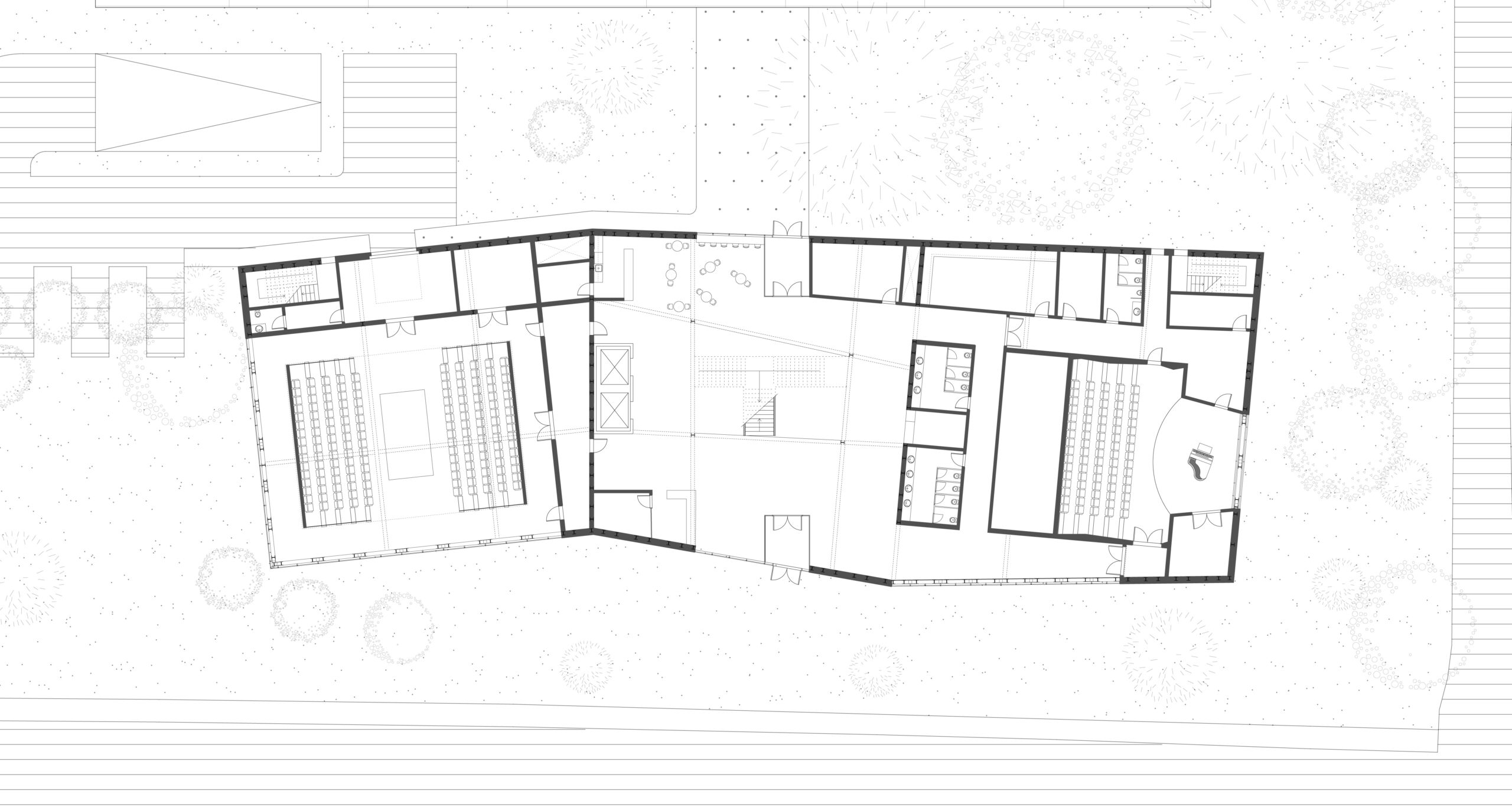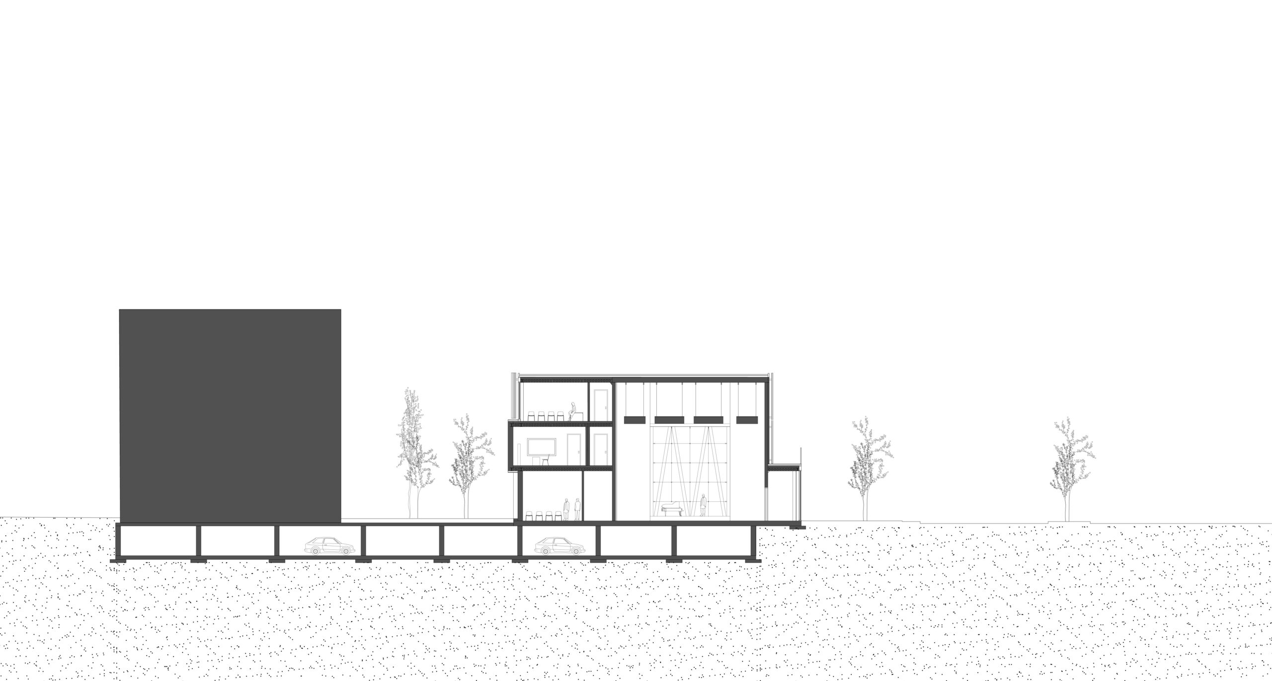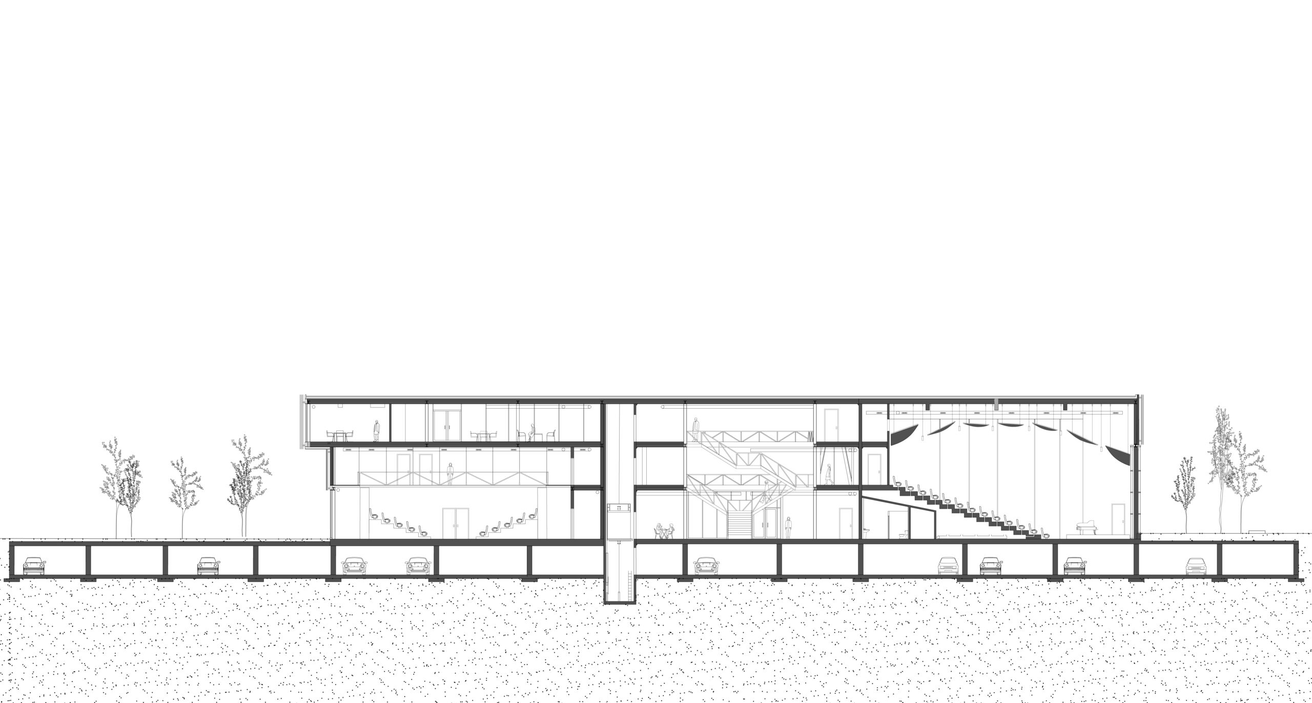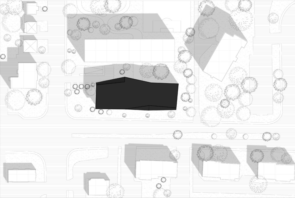 En plus des fonctions communautaires, l’espace lecture, les classes et la salle multidisciplinaire, s’ajoutent au programme des fonctions le liant directement au concept musical : un auditorium, pouvant accueillir plus d’une centaine de personnes, des studios d’enregistrement et des espaces de pratique de musique disponibles pour tous. De ces fonctions découle la forme globale du bâtiment, soit une forme angulaire venant briser la linéarité du site, tels les panneaux acoustiques d’une salle de spectacle. Ces angularités permettent aussi de venir chercher une largeur plus importante que celle associé à l’empreinte au sol tout en ajoutant un troisième rythme à la façade. Ces différentes interventions sont toutes marquées par la répétition d’un thème : la triangulation, l’ondulation et l’angularité.