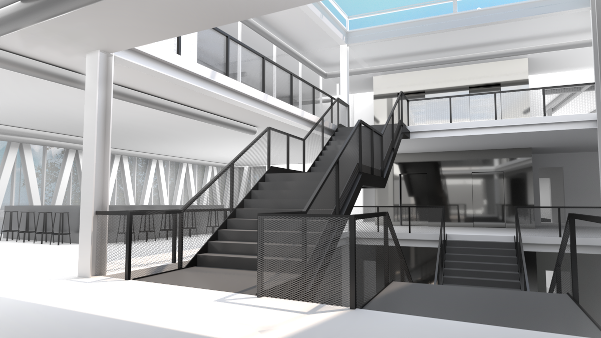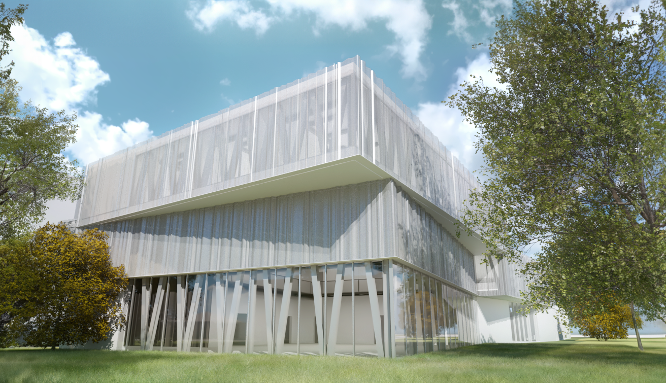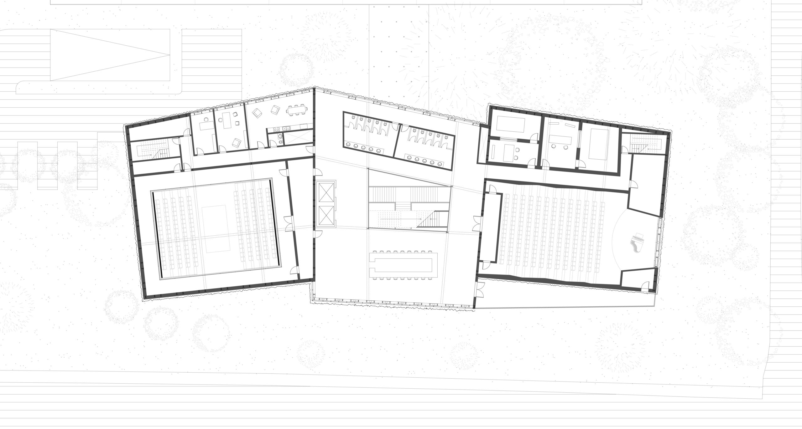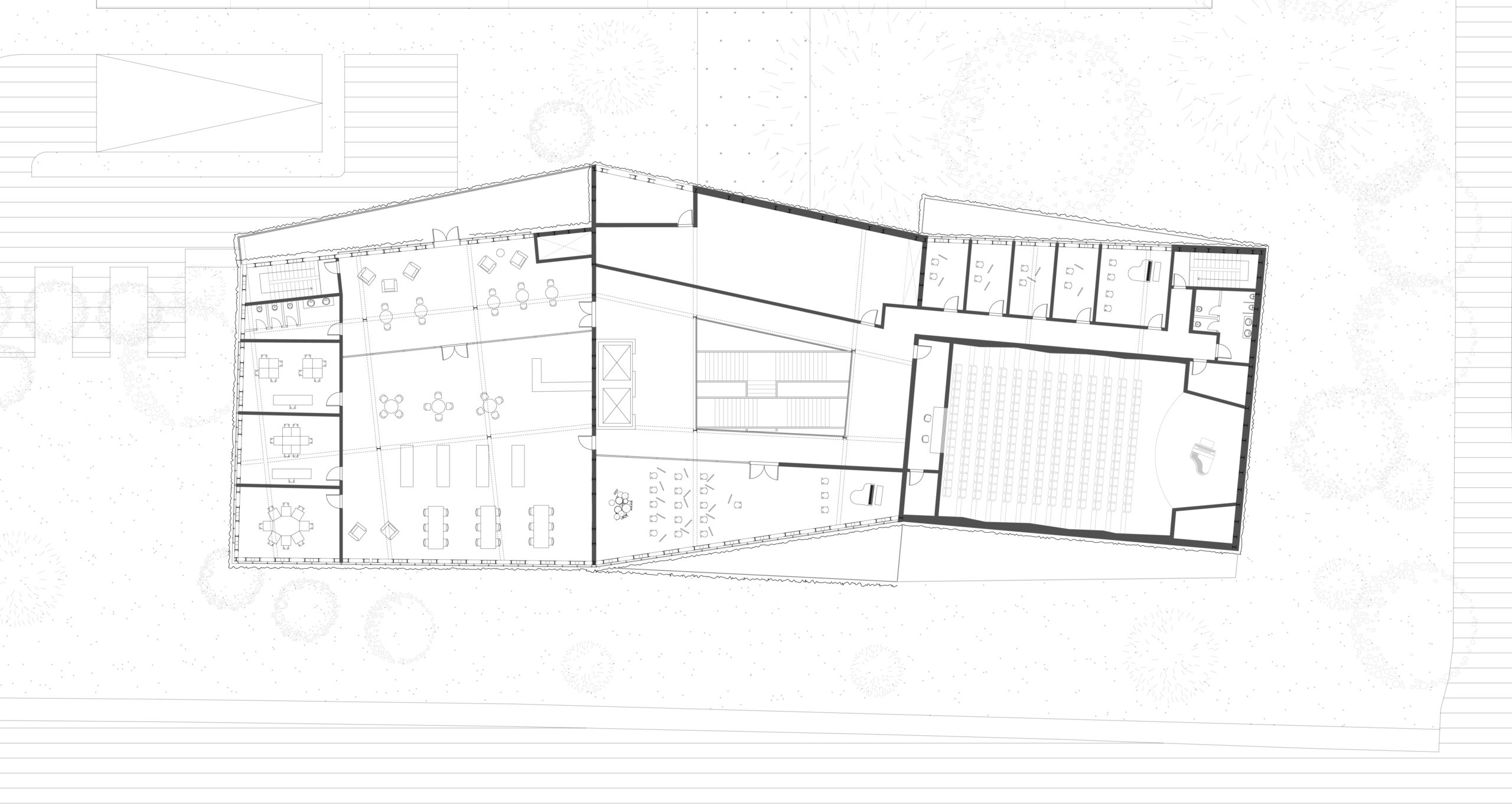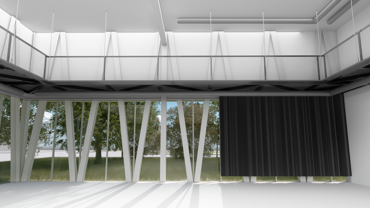 En plus des fonctions communautaires, l’espace lecture, les classes et la salle multidisciplinaire, s’ajoutent au programme des fonctions le liant directement au concept musical : un auditorium, pouvant accueillir plus d’une centaine de personnes, des studios d’enregistrement et des espaces de pratique de musique disponibles pour tous. De ces fonctions découle la forme globale du bâtiment, soit une forme angulaire venant briser la linéarité du site, tels les panneaux acoustiques d’une salle de spectacle. Ces angularités permettent aussi de venir chercher une largeur plus importante que celle associé à l’empreinte au sol tout en ajoutant un troisième rythme à la façade. Ces différentes interventions sont toutes marquées par la répétition d’un thème : la triangulation, l’ondulation et l’angularité.